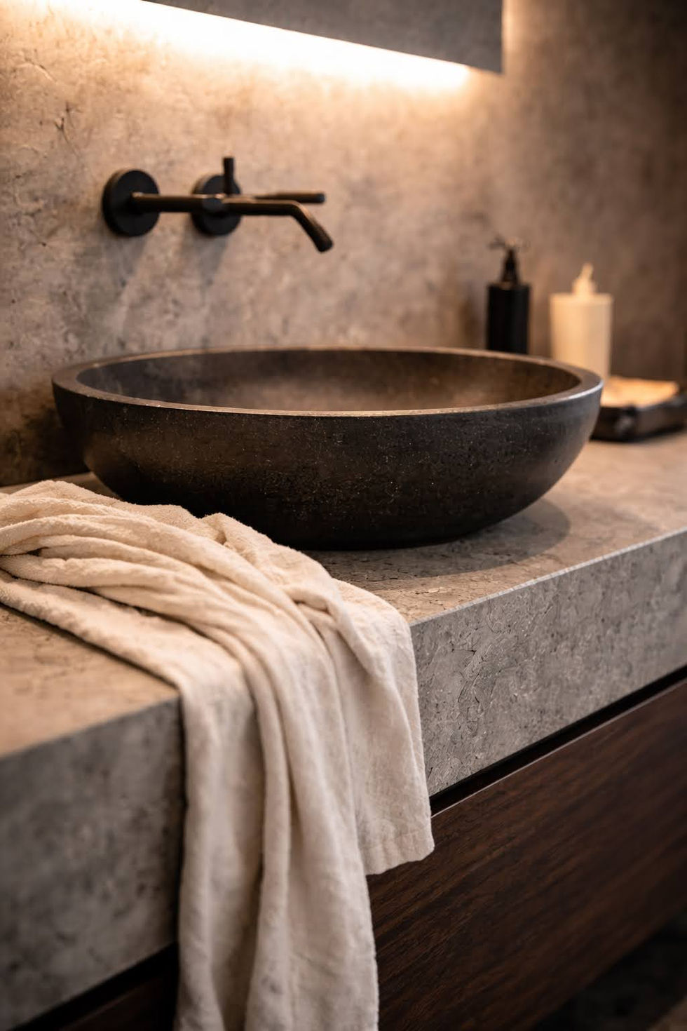 This residential project in Cyprus, represents a sophisticated fusion of minimalist architecture and structural honesty, characterized by its prominent use of raw exposed concrete and dark steel accents. The design focuses on clean, geometric lines and an open-plan layout that emphasizes volume and natural light through expansive, black-framed floor-to-ceiling glazing. Inside, the industrial aesthetic is refined by warm hardwood flooring and a sculptural, open-tread staircase with a glass balustrade, while the kitchen serves as a monolithic centerpiece with matte-black cabinetry and a stone island. Every element—from the integrated linear fireplace to the technical black ceiling spotlights—is meticulously curated to create a bold, contemporary sanctuary that balances the ruggedness of its materials with the elegance of modern urban living.