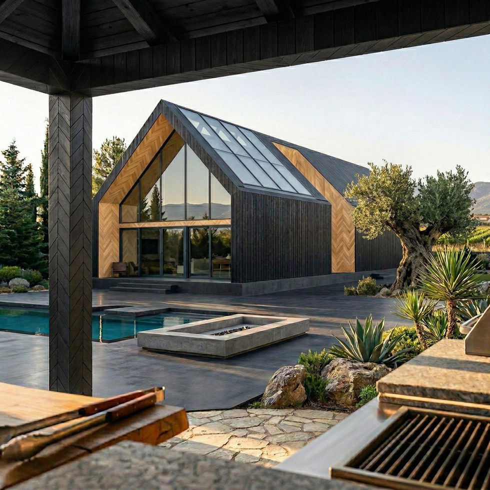 This sleek two-story retreat masterfully blends bold, modern lines with its peaceful vineyard backdrop. The iconic A-frame silhouette is wrapped in dark metal cladding, creating a sharp contrast against the floor-to-ceiling glass that floods the three-bedroom interior with natural light. Outside, the polished stone terrace, sunken pool, and integrated fire pit are designed for seamless indoor-outdoor living, making it the perfect spot for family gatherings at sunset. It’s a space that feels both high-end and deeply connected to the surrounding mountains and olive trees.